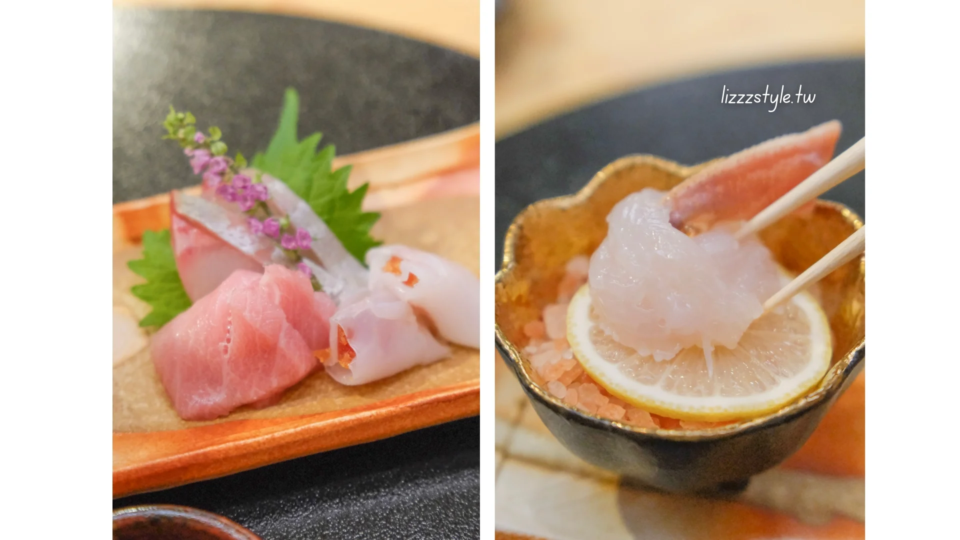 這道刺身盛合建議由左至右依序品嚐,首先是鮮甜的蟹刺身,蟹肉滿是充滿甘甜的鮮味,肉質冰冰涼涼,味道毫無雜質。
