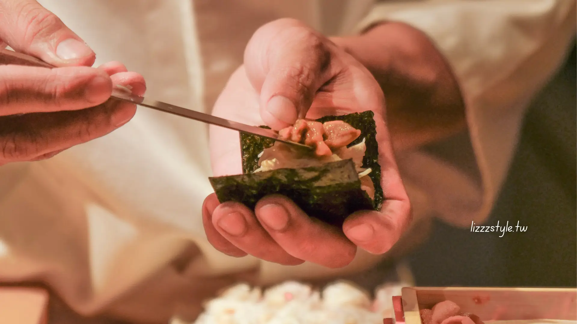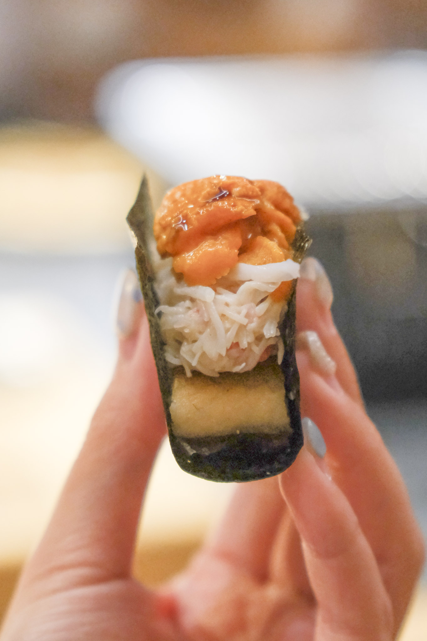 師傅那種「給料毫不手軟」的大方氣度,就已經先贏了一半!他將海膽一匙又一匙地堆疊在手卷上方,加上新鮮又絲絲分明的鮮甜蟹肉、白鰻魚,完全把三種海味以最佳的層次感呈現。