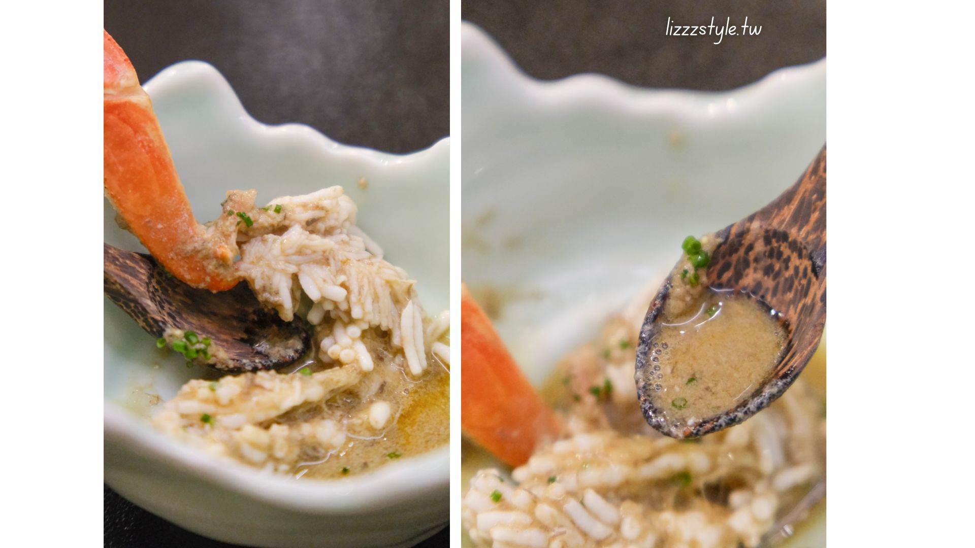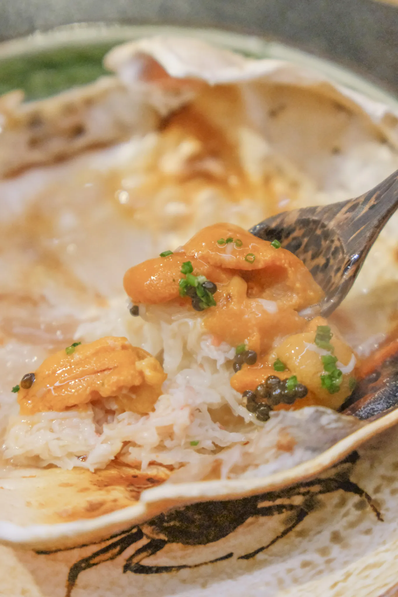 螃蟹殼作為容器,裡面呈裝了滿滿的蟹膏和濃郁的味噌醬,蟹足肉也在過程中一同搭配烹煮,肉質更顯甘甜。