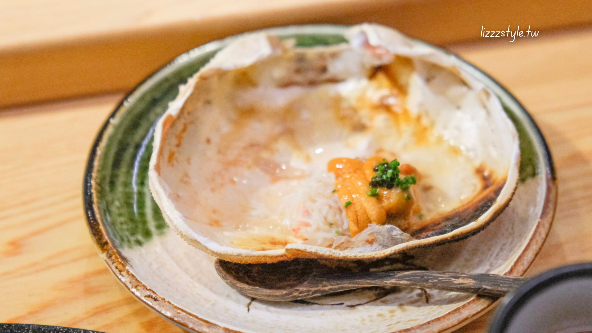 蟹肉海膽甲殼燒這一道以松茸熬煮的高湯作為基底,使高湯帶有一股獨特的清香。甲殼上放上蟹肉和大量的新鮮海膽一同完美融合,蟹肉的鮮甜和高湯的溫潤層層交織,呈現出富有層次的濃厚感。