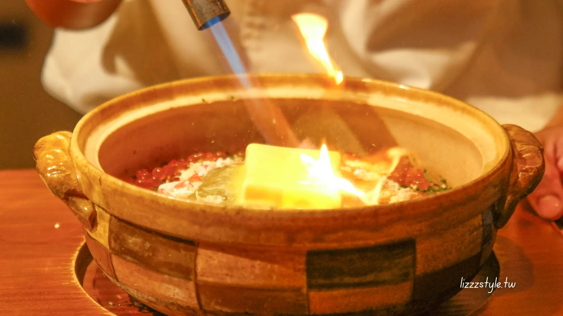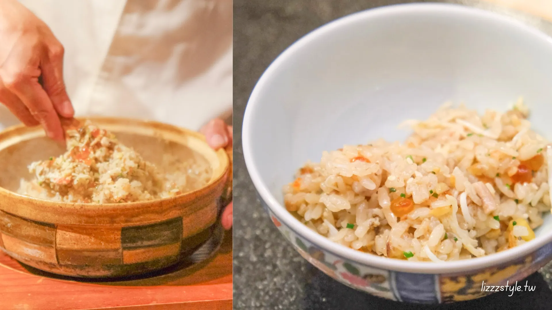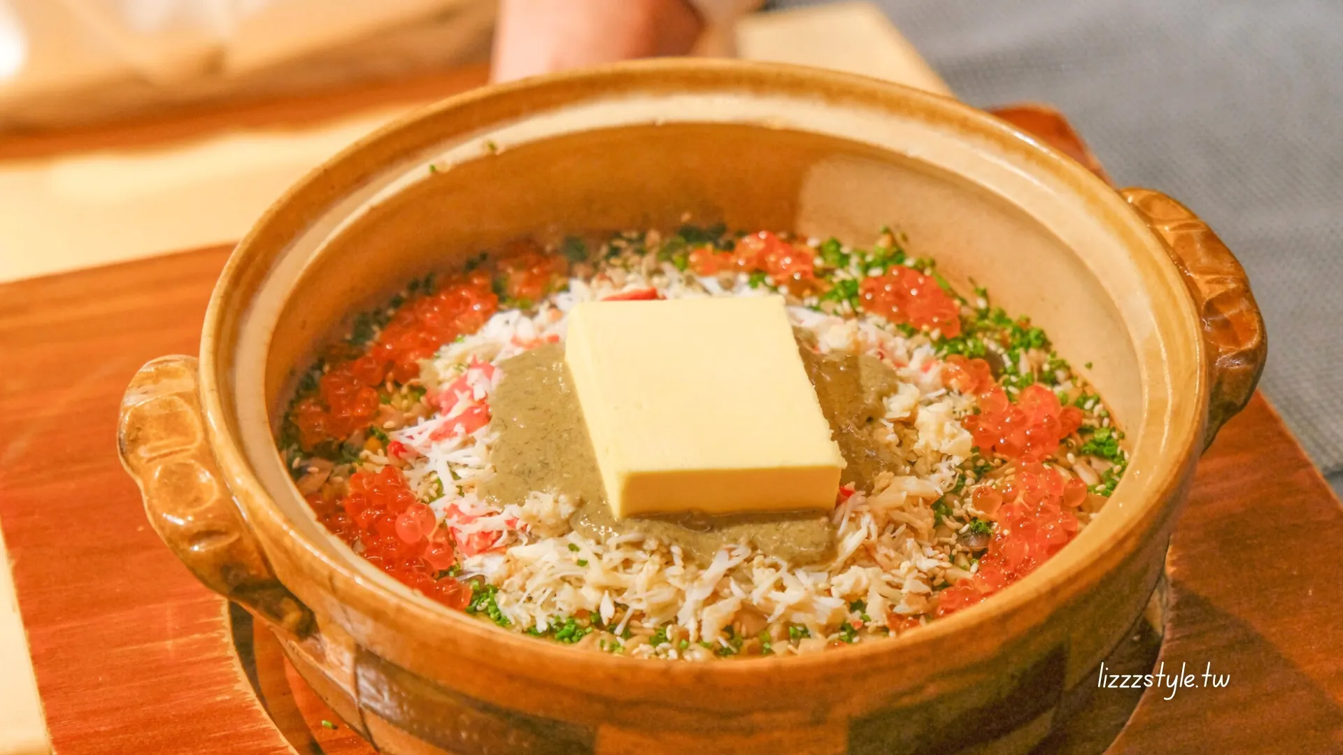 這份釜飯的配料以大量的鮭魚卵、鮮甜蟹肉、濃郁蟹膏、栗子等豐富食材層層堆疊,最關鍵的靈魂是那塊奶油。