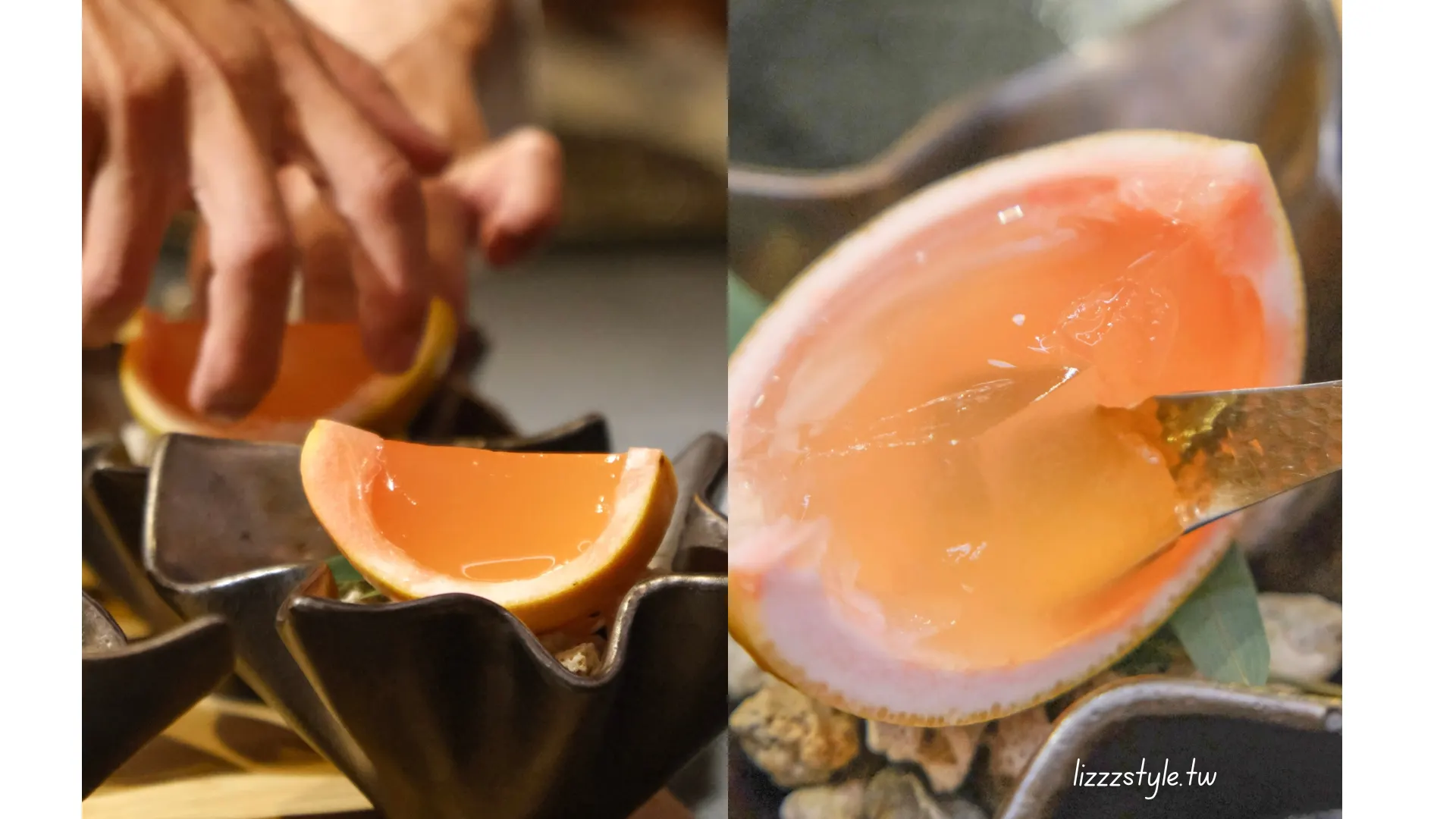 以清爽的茶凍為基底,搭配果香濃郁、葡萄柚味滿滿的酸甜滋味,十分解膩,為這餐畫下完美的句點。