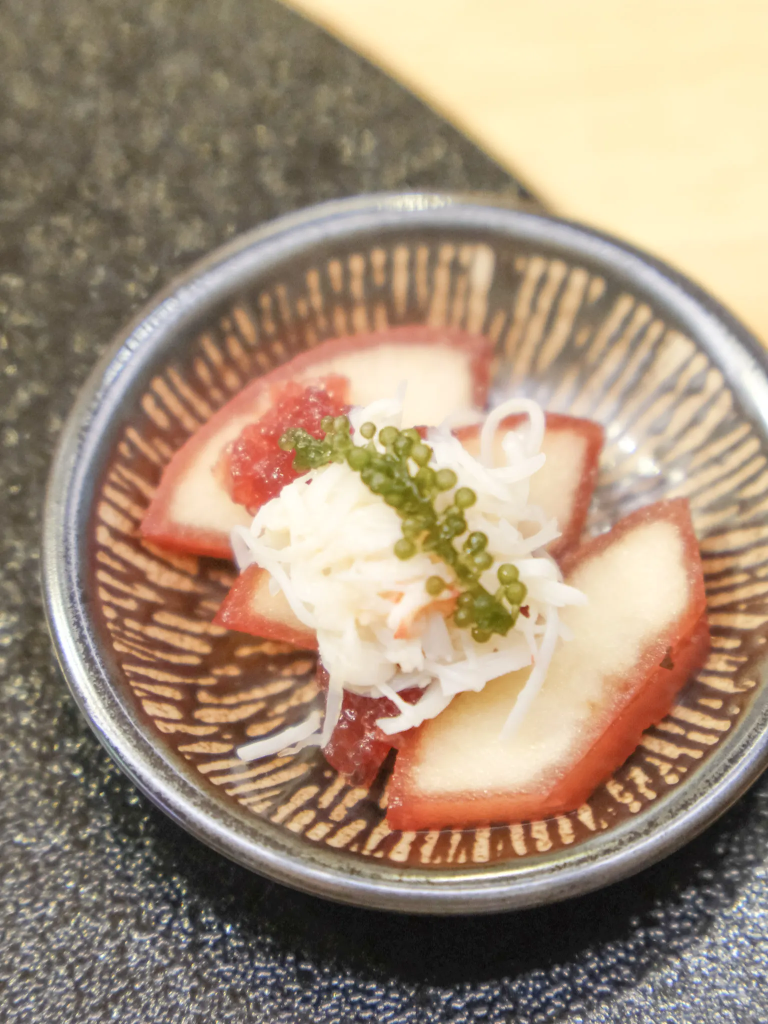 中間是台灣澎湖的軟絲,本身帶有黏滑的口感,具有自然的甜度,搭配少許烏魚子,一口咬下瞬間散發濃郁鹹香的滋味,是非常在地化的特色搭配。