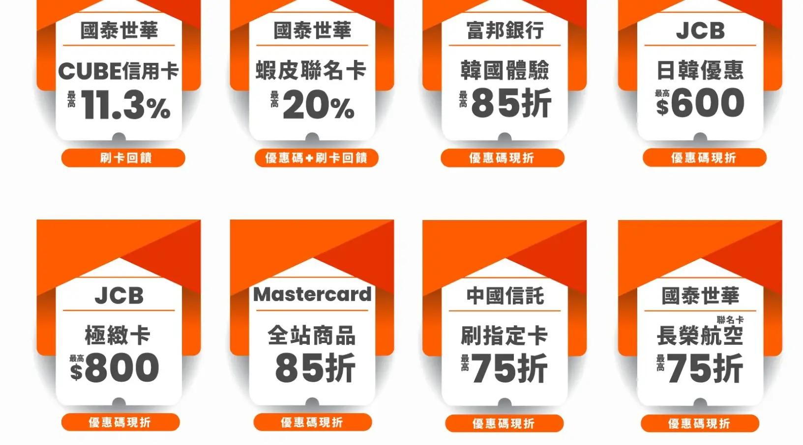 | 國泰世華CUBE信用卡 | ▪︎最高11.3%回饋 ▪︎全站98折 ▪︎新戶全站9折 ▪︎全球飯店92折 | 無 ▪︎CUB2598 ▪︎CUBNEW259 ▪︎CUBHOT2592 |