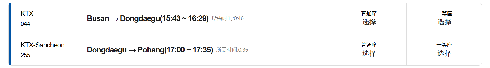大邱到浦項KTX10900韓元(手機APP可提前買票)、搭巴士11000韓元(現場購票)。