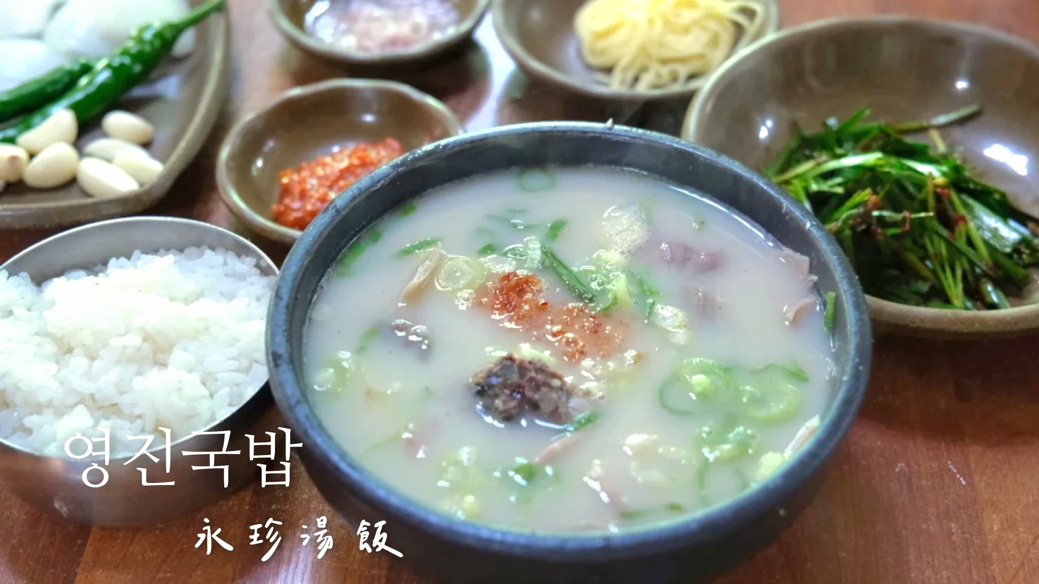 ▲而原湯頭是已經事先調味過的,裡面的青蔥提了一點蔥的清甜,一開始沒用蝦醬調味的湯頭就已經很有味道,也是永珍湯飯的特色之一,湯有種濃郁中透點鮮鹹的感覺,是經典的密陽式豬肉湯飯,第一口下去老實說真的蠻驚豔的!
